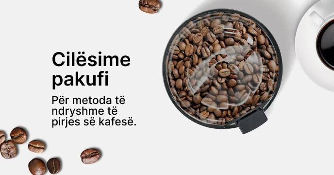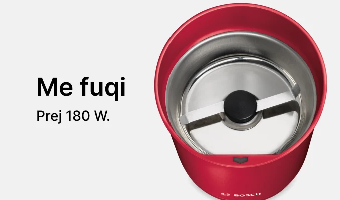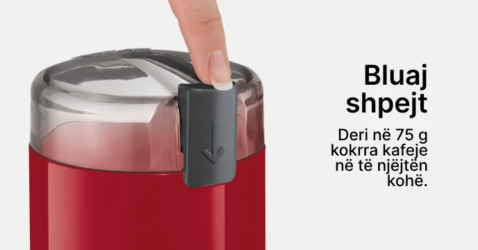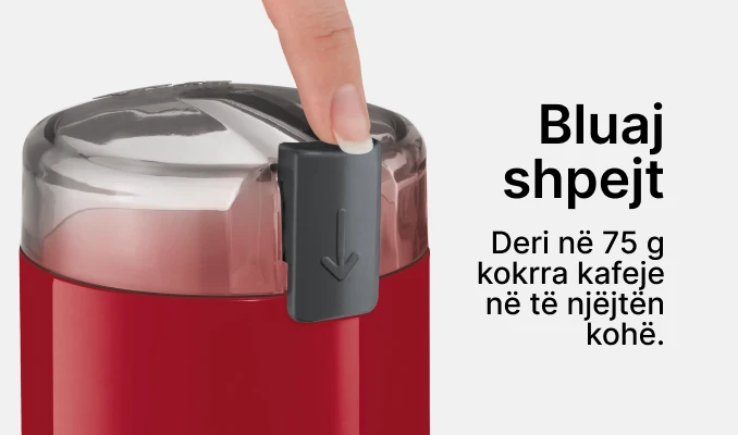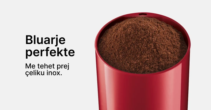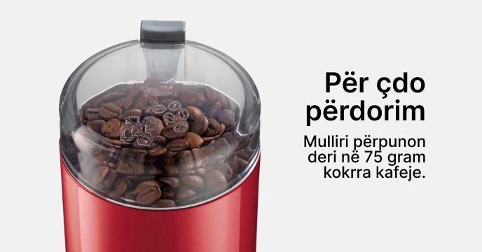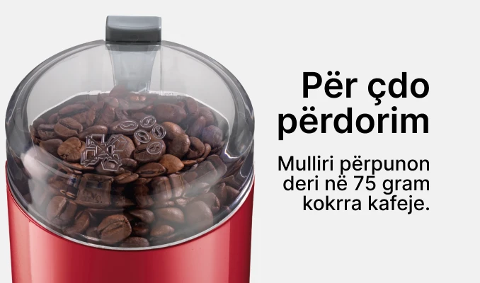 Mulli kafeje është krijuar për ata që duan të shijojnë shijen e freskët të kafesë në shtëpi - duke kombinuar performancën e bluarjes profesionale me stilin e pagabueshëm. Një mulli kafeje është një pajisje që përdoret për të bluar kokrrat e kafesë në grimca më të vogla. Kjo pajisje përdor një teh rrotullues për të prerë kokrrat e kafesë në copa më të vogla dhe nuk humb shijen e kafes në asnë mënyrë. Me një fuqi prej 180 W, kjo mu mund të bluajë shpejt deri në 75 g kokrra kafeje në të njëjtën kohë. Tehët e çelikut inox sigurojnë që kokrrat tuaja të kafesë të bluhen në mënyrë të barabartë dhe efikase.