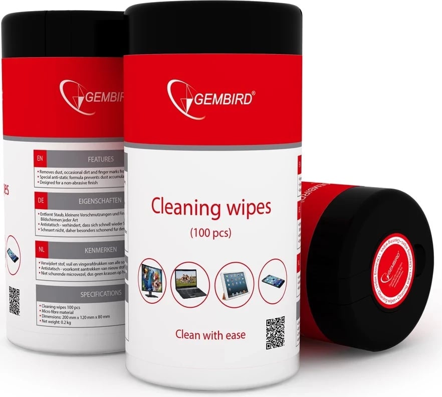 Seti për pastrim GEMBIRD CK-WW100-01 është ideal për pastrimin e pajisjeve elektronike si LCD, TFT dhe Plasma. Përmban 100 copë leckë të thata mikrofibër që janë efektive për pastrimin e sipërfaqeve delikate pa shkaktuar gërvishtje. Produkti është i zi dhe vjen në një paketim me dimensione 165 mm në thellësi, lartësi dhe gjerësi, dhe peshon 200 gram.