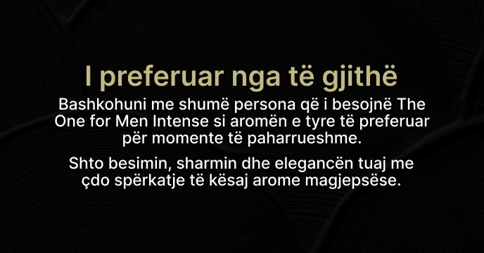 The One for Men Eau de Parfum Intense sjell një intensitet të ri në linjën Dolce&Gabbana The One For Men. Ai prezanton magnetizëm të parezistueshëm dhe sofistikim të përjetshëm. Notat e sipërme pikante të esencës së artë neroli, të shkrirë me selvi të freskët dhe aromën afatgjatë të kardamonit aromatik ofrojnë një kontrast unik me notat bazë të bëra prej lëkure të thellë dhe ëmbëlsinë e paçulit dhe aromave mesdhetare të cistus labdanum.