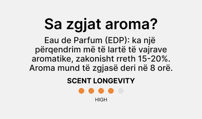 Kombinimi i notave të freskëta, lulesh dhe druri krijon një aromë të rrumbullakosur dhe të ekuilibruar që është sa elegante dhe sensuale. Dizajni elegant dhe modern i shishes, i cili përmban një fjongo delikate, i shton një prekje feminitetit dhe elegancës përvojës së përgjithshme të aromës.