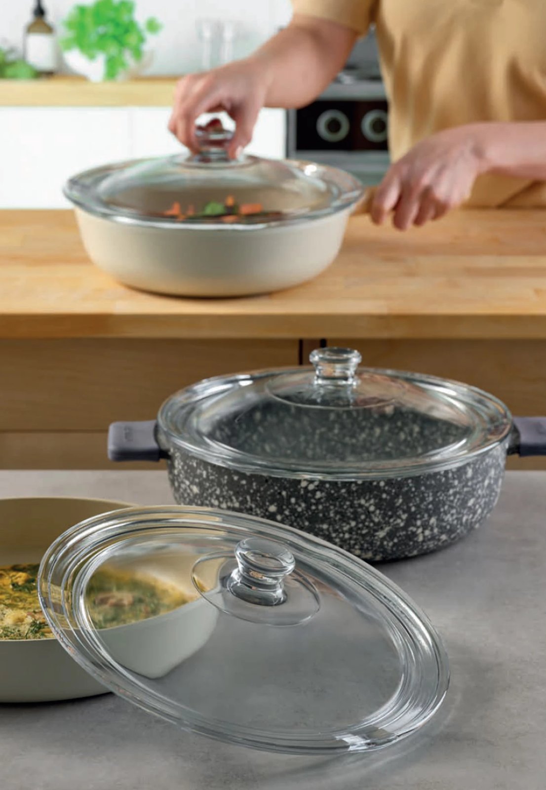 Kapaku borcam ëdhtë rezistent ndaj nxehtësisë. Për shkak të modelit të tij ky kapak është i përshtatshëm për tenxhere dhe tigane me dimensione të ndryshme.