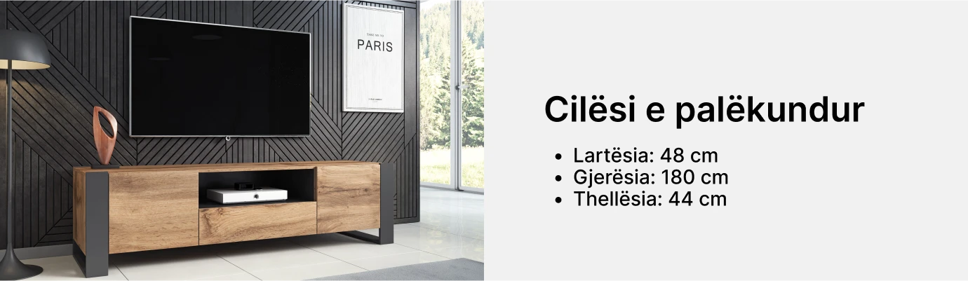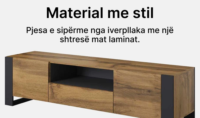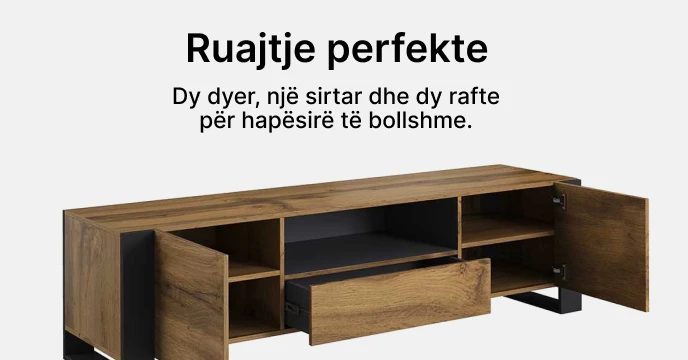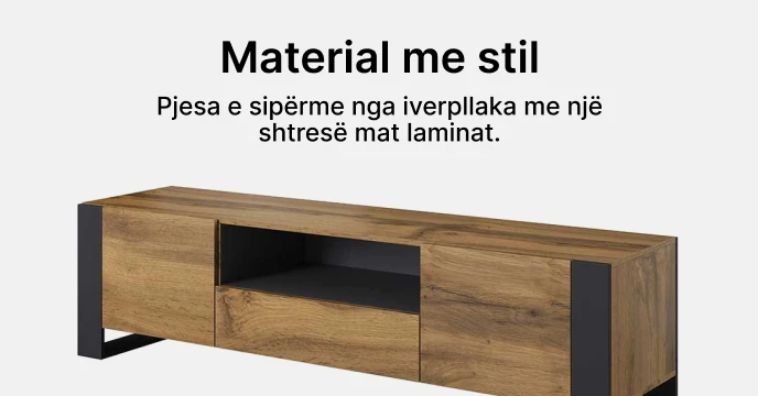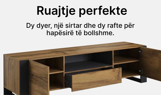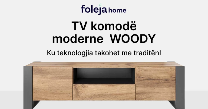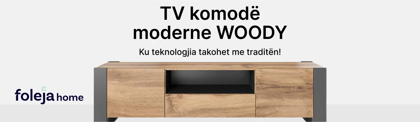 TV Komoda WOODY është një mobilie moderne dhe me stil që do t'i shtojë një prekje elegance çdo dhome ndenjeje. Korniza është prej materialit të iverpllakës, duke siguruar qëndrueshmëri dhe jetëgjatësi. TV komoda përmban dy dyer, një sirtar dhe dy rafte, duke ofruar shumë hapësirë ruajtëse për të gjitha pajisjet dhe aksesorët tuaj të medias.