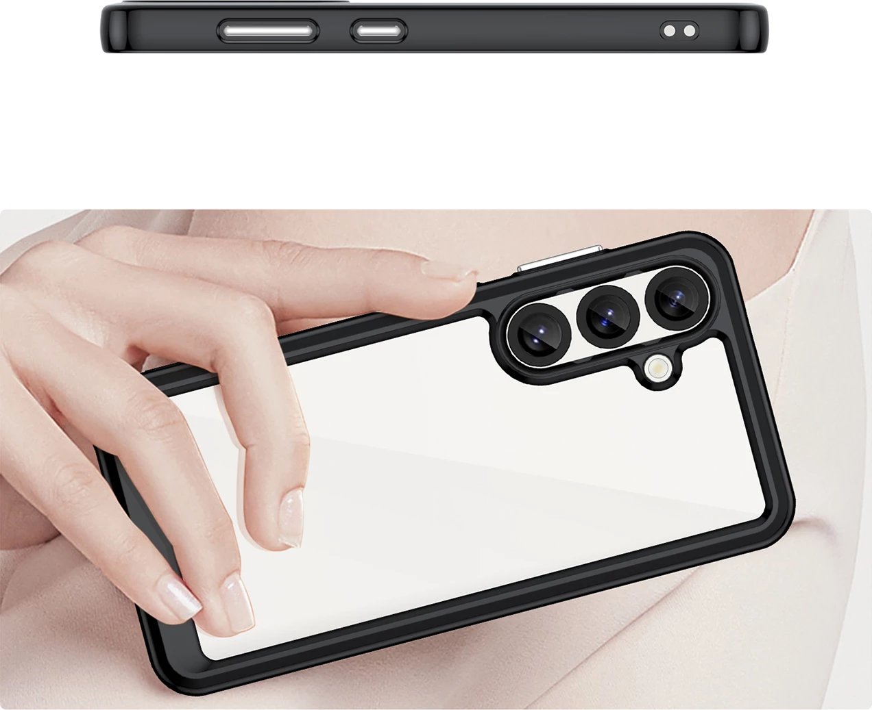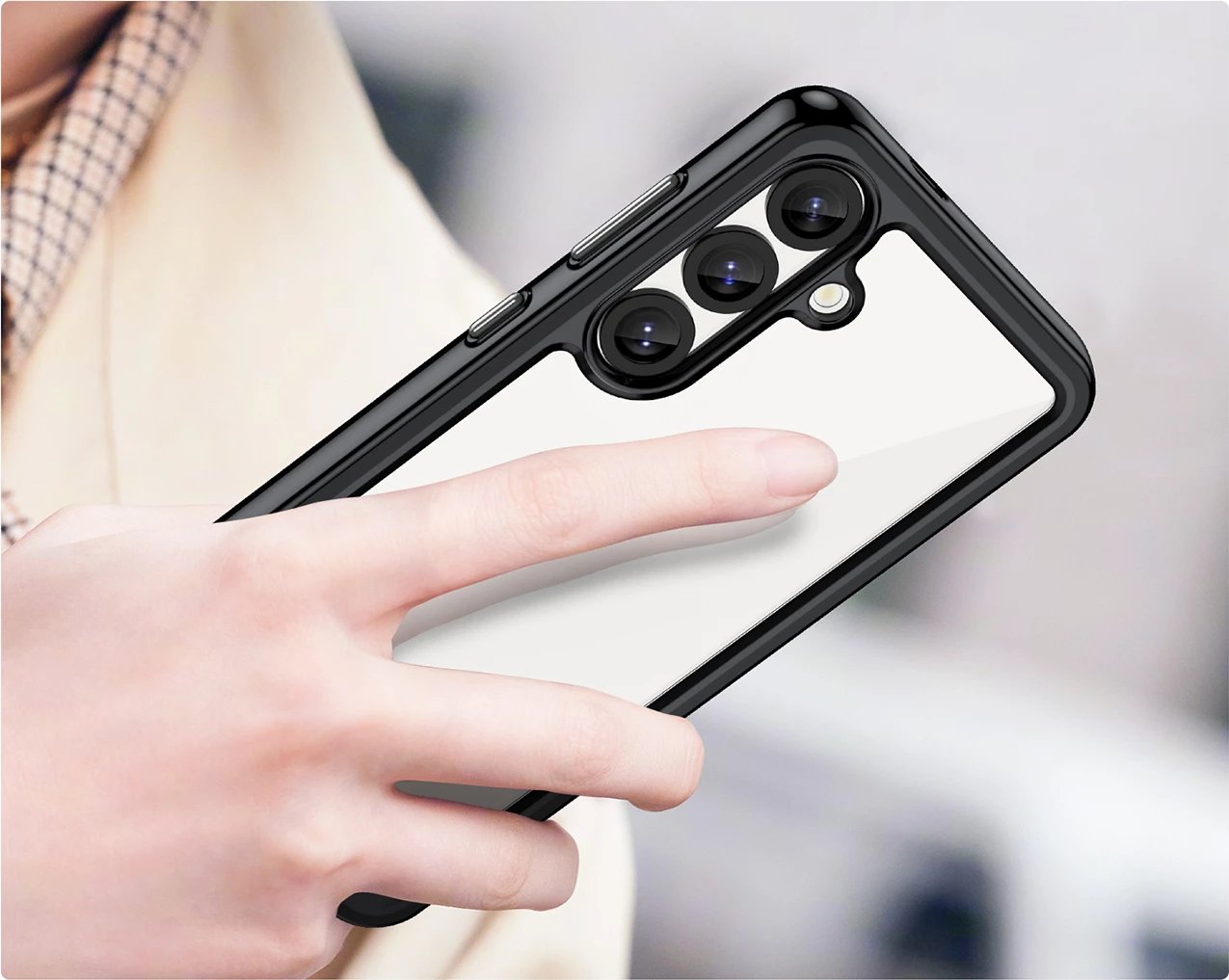 Korniza e ngritur rreth ekranit dhe kamerës mbron pjesët më të ndjeshme të pajisjes, ndërsa prerjet precize dhe butonat e integruar mundësojnë përdorim të lehtë pa hequr mbështjellësin. Dizajni transparent me detaje të zeza i jep telefonit një pamje elegante dhe bashkëkohore.