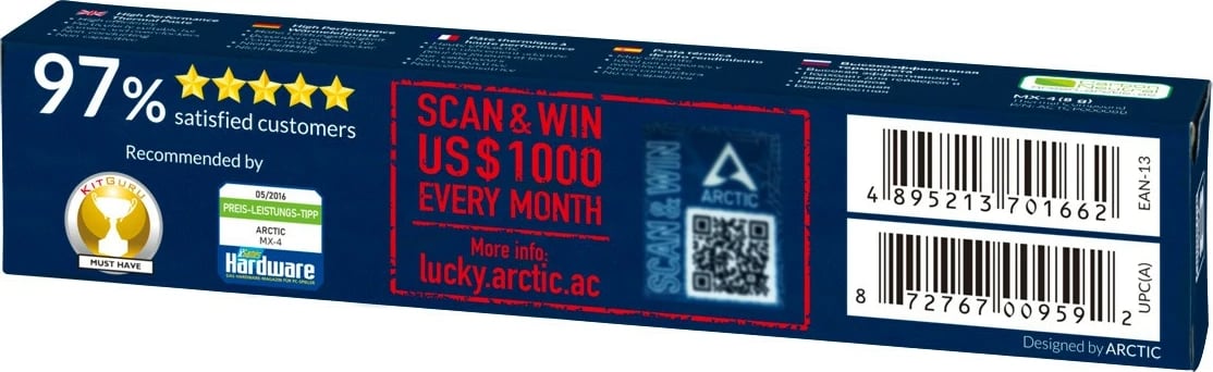 Pasta termale ARCTIC MX-4 (8 g) Edition 2019 është një pastë termale me performancë të lartë, e cila përdoret për të përmirësuar përçueshmërinë termike ndërmjet një CPU ose GPU dhe ftohësit të tij, duke siguruar shpërndarje efikase të nxehtësisë. Është jo-kapacitive dhe jo-përçuese, duke e bërë të sigurt për përdorim rreth komponentëve elektronikë. Pasta është e përbërë nga mikro-partikula karboni, duke ofruar një përçueshmëri termike prej 8.5 W/m·K. Është e lehtë për t'u aplikuar, e qëndrueshme dhe vjen në një paketim të qëndrueshëm dhe të riciklueshëm.