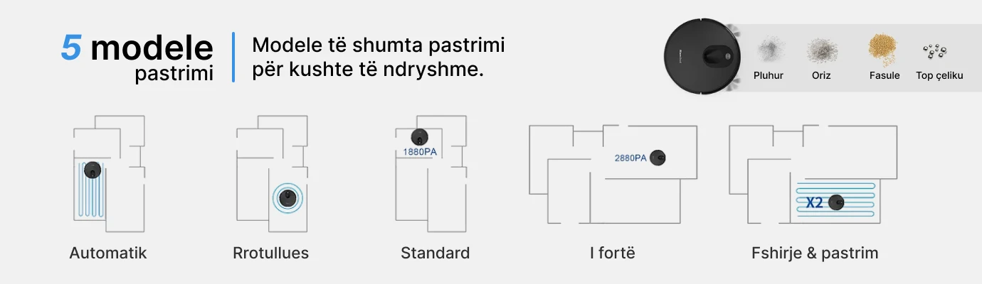 Përveç kësaj, fshesat robotike janë të programuara për të njohur dhe për t’u përshtatur me lloje të ndryshme të dyshemeve, qoftë parketi, pllakat, tapetet apo sipërfaqet e kombinuara. Kjo fleksibilitet bën që ato të ofrojnë pastrim të thellë dhe të personalizuar, duke larguar pluhurin, qimet e kafshëve dhe mbeturinat e tjera në mënyrë të shpejtë dhe efikase. Motorët e fuqishëm dhe sistemet e integruara për thithje sigurojnë performancë të lartë në çdo situatë, edhe nëse përballen me papastërti të imëta apo mbetje më të mëdha.