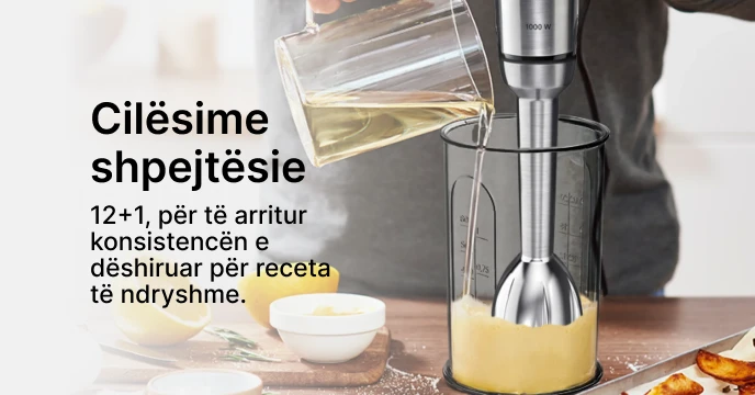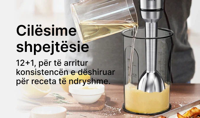 - Performanca e fuqishme: Blenderi i dorës është i pajisur me një motor të fuqishëm 1000 W, duke siguruar performancë të fuqishme përzierjeje për një sërë përbërësish.